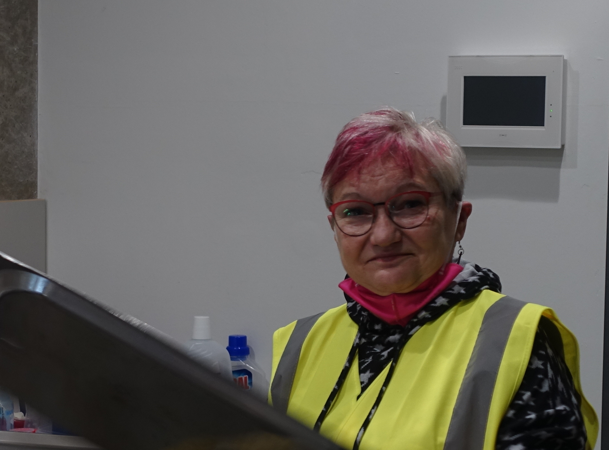 Heute gibt es zum ersten Mal Borschtsch zum Mittag. Nach den vielen Gerichten aus deutscher Küche sei man den Bitten der rund 120 Turnhallen-Bewohner nachgekommen, meint Marc Fuchs. Er gehört zum Caterer Canapémanufaktur und ist heute in der Vormittagsschicht für die Essenausgabe zuständig. Gegenüber wäscht Petra Kühnlein gerade Geschirr an der Getränketheke ab. Hier können sich die Turnhallenbewohner selbst bedienen. „Heute vormittag hat eine Mutter um eine kleine Portion Spaghetti für ihre Tochter gebeten. Den Wunsch haben wir ihr erfüllt“, erzählt die Rentnerin aus Weinböhla, die sich als ehrenamtliche Helferin bei der Maltesern gemeldet hat und heute den ersten Tag da ist. „Ich mache das, was gerade anfällt“, sagt sie und will wiederkommen. „Die Menschen brauchen hier Freundlichkeit. Das will ich gern geben.“