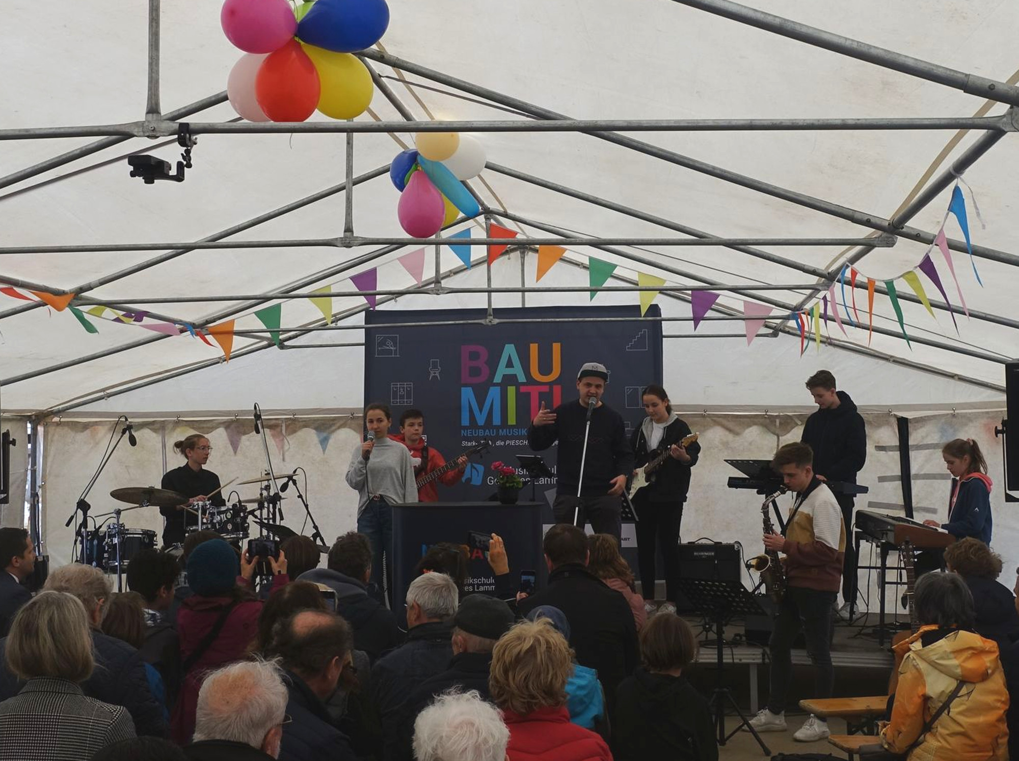 Von der Qualität des Unterrichts, in dem die rund 1.100 Kinder und Jugendlichen bei mehr als 50 Lehrkräften lernen, konnten sich die Eltern, Anwohner, Bauleute und anderen Gäste auf vielfältige Weise überzeugen. Schon zur Begrüßung trommelten die Percussion Kids und die etwas Größeren aus der Schlagzeuggruppe. Auf der Bühne bot die Musikschul-Band „Hot Ice Cream“ Popmusik, zeitweise unterstützt von Ex-Musikschüler Johann Beurich, alias Dor Fuchs, bekannt als Youtube-Star mit Mathesongs.