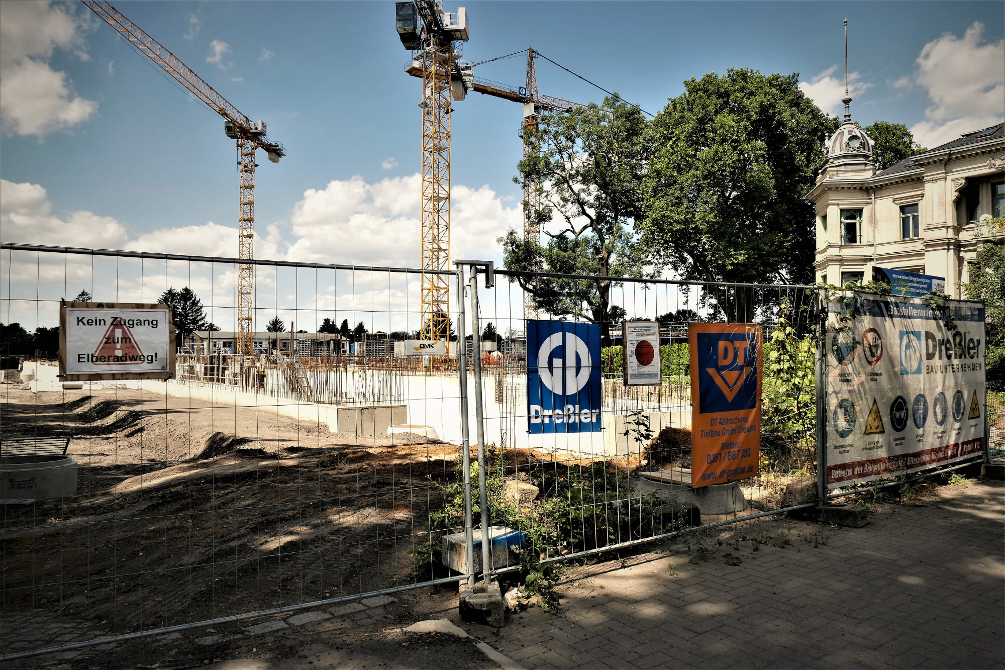 Bis Herbst 2024 werden in Nachbarschaft zur „Grumbt-Villa“ (offizielle Bezeichnung des Denkmals) vier fünfgeschossige Gebäude mit 210 Wohnungen entstehen. Foto: K. Brendler