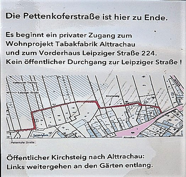 Das nördliche Ende der Pettenkoferstraße wird durch ein Hinweisschild der Bewohner des „Wohnprojektes Tabakfabrik Alttrachau“ markiert. Diese hatten die ehemalige Fabrik 2010 erworben und gemeinsam in Wohnungen umgewandelt.