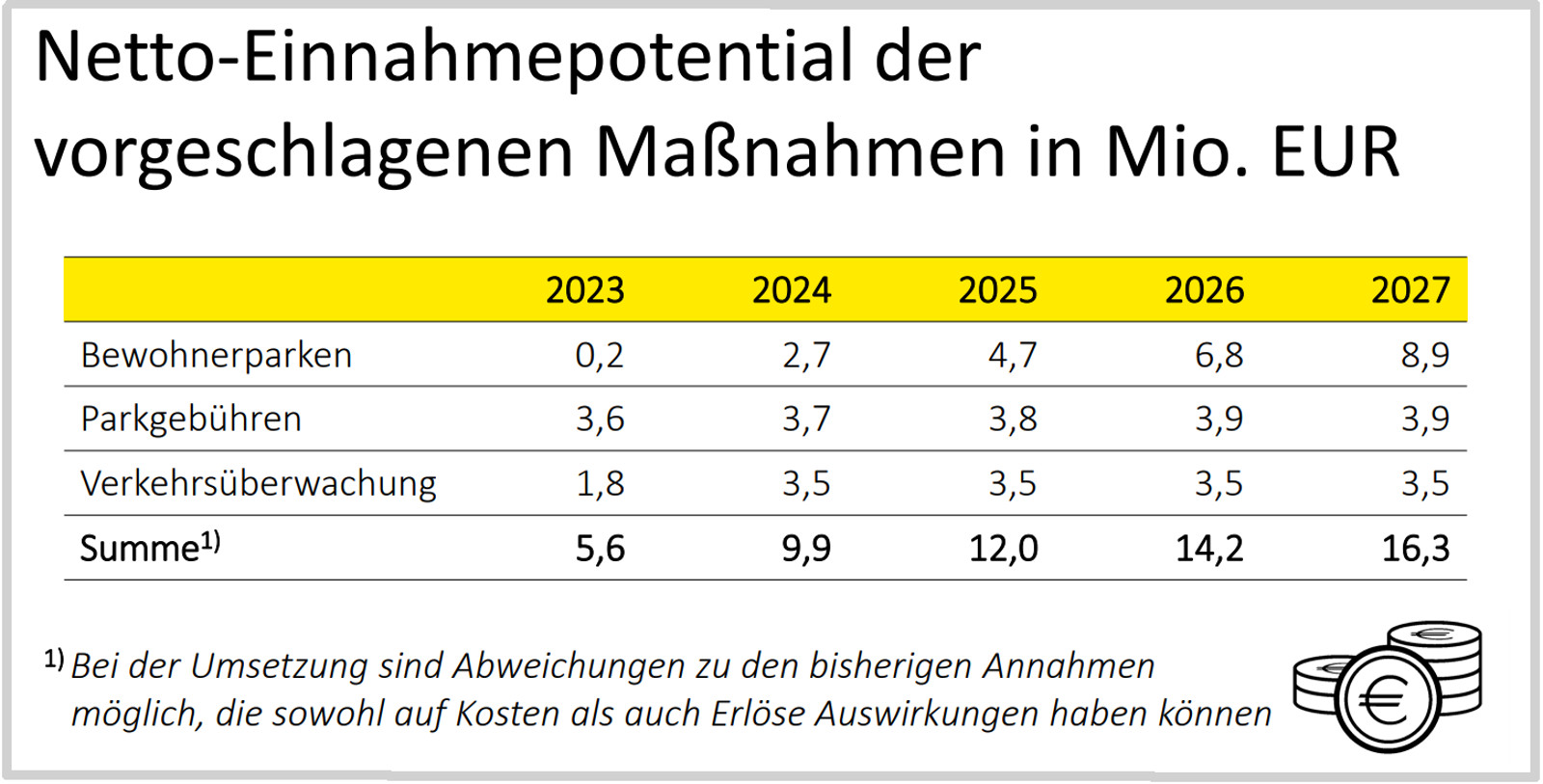 Der Schwerpunkt der 2020 fertig gestellten Studie lag jedoch auf der Verbesserung der angespannten Parksituation und nicht auf der Erwirtschaftung zusätzlicher Einnahmen für den Stadthaushalt. Genau das wird bis 2027 noch für viel Diskussion sorgen.