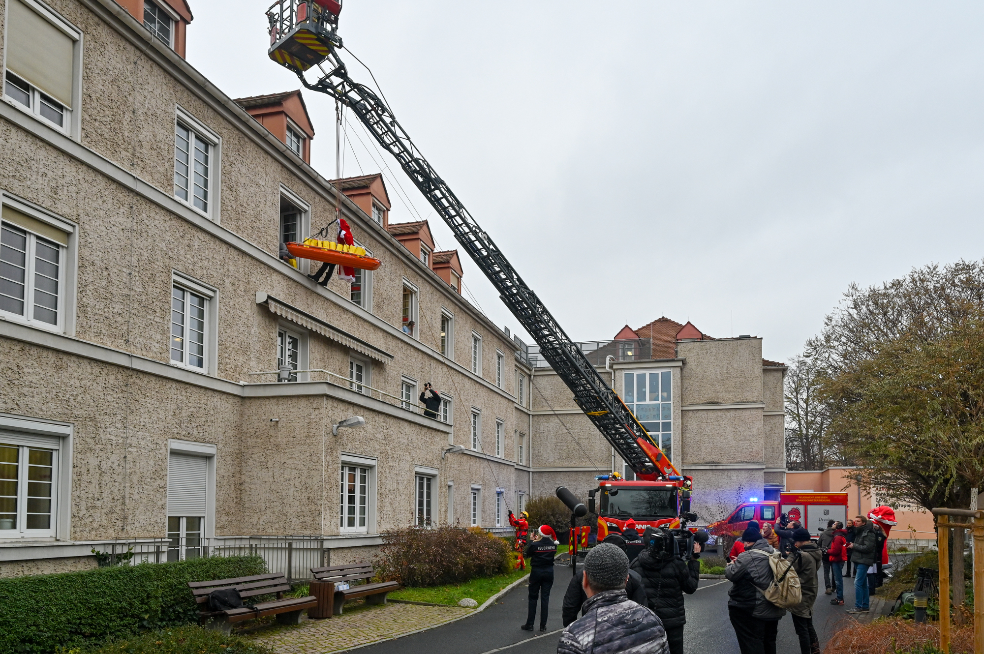 Eine besondere Überraschung bereiteten Dresdner Feuerwehrleute heute Kindern und Jugendlichen im Städtischen Klinikum in Trachau. Zum Nikolaustag brachten sie Geschenke auf ungewöhnlichem Weg. Der Nikolaus kam durch die Luft zu den jungen Patienten der Klinik für Kinder- und Jugendmedizin. Ein großer Kran sorgte dafür, dass die (verkleideten) Experten der Höhenrettung aus der Feuer- und Rettungswache Löbtau aus 30 Metern Höhe samt Geschenken direkt vor den Fenstern einschweben konnten. Auch das Maskottchen des Brandschutzerziehungszentrums „Hydro“ ließ es sich nicht nehmen, an diesem Tag zu unterstützen. Es beschenkte die Kinder persönlich, die wegen ihrer Erkrankung das Bett nicht verlassen können.