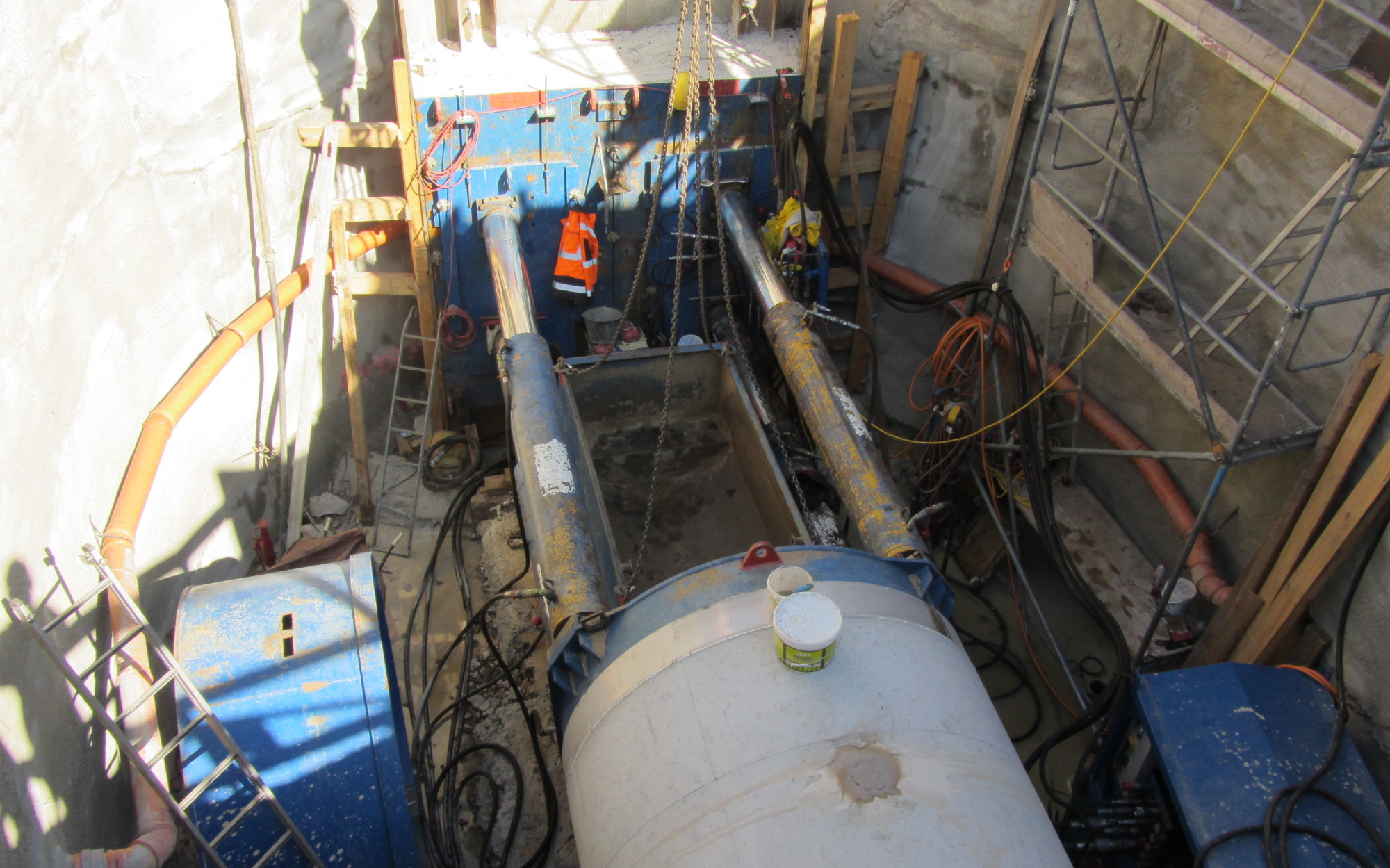 Mit einer hydraulischen Presse werden die Rohre in 5 Meter Tiefe durch das Erdreich gedrückt. Foto: SEDD