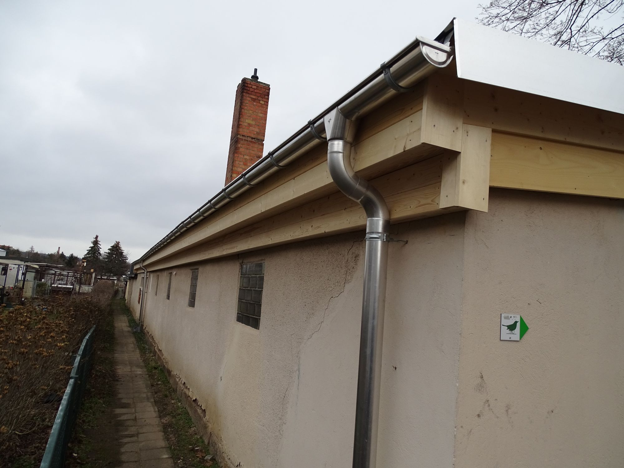 Schon Ende November war das Dach dicht. Drei Wochen hatten Handwerker der Zimmerei Voigt aus Reichstädt vor Ort gearbeitet. Jetzt leuchten das frische Holz der Dachkästen und die neuen Regenrinnen in der Sonne. „Die Malerarbeiten an den Dachkästen übernehmen wir in Eigenregie“, erklärte Karla Händler, Vorsitzende des Kleingartenvereins Sommerfrische bei einem Vor-Ort-Termin im Februar. Unangenehme Überraschungen während der Arbeiten sind ausgeblieben.