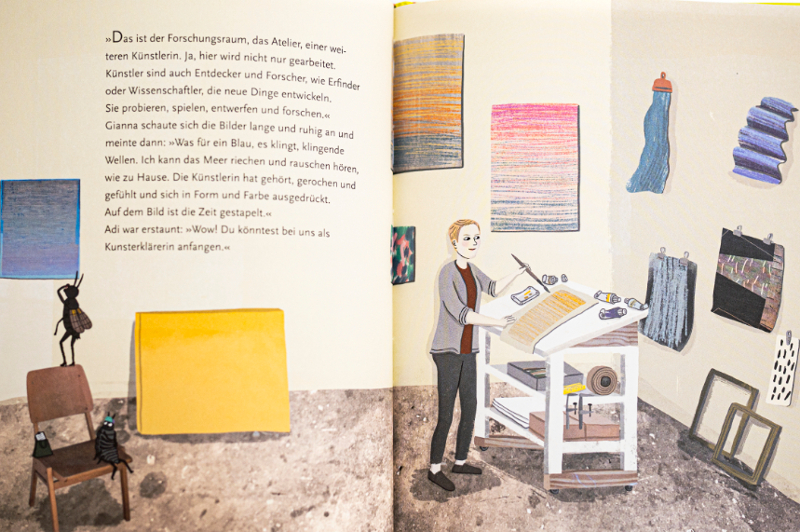 Die beiden Protagonisten der Geschichte, Adi die Assel und Gianna die Grille, zeigen jungen wie älteren Leserinnen und Lesern alle Ecken und Enden der Geh8 und bieten so tiefe Einblicke in den Alltag und den Betrieb des freien Kunstzentrums. Beim Lesen fällt schnell auf, wie viele Bereiche unter dem Dach der ehemaligen Wagenreparaturhalle der Deutschen Bahn aufeinandertreffen. Man erhascht Blicke hinter die Kulissen, wenn im Werkraum über zeitgenössische Kunst gefachsimpelt wird, das alljährliche Verstärker Filmfest in vollem Gang ist und die Künstlerinnen und Künstler in ihren Ateliers malen, töpfern oder Hasen sprengen.
