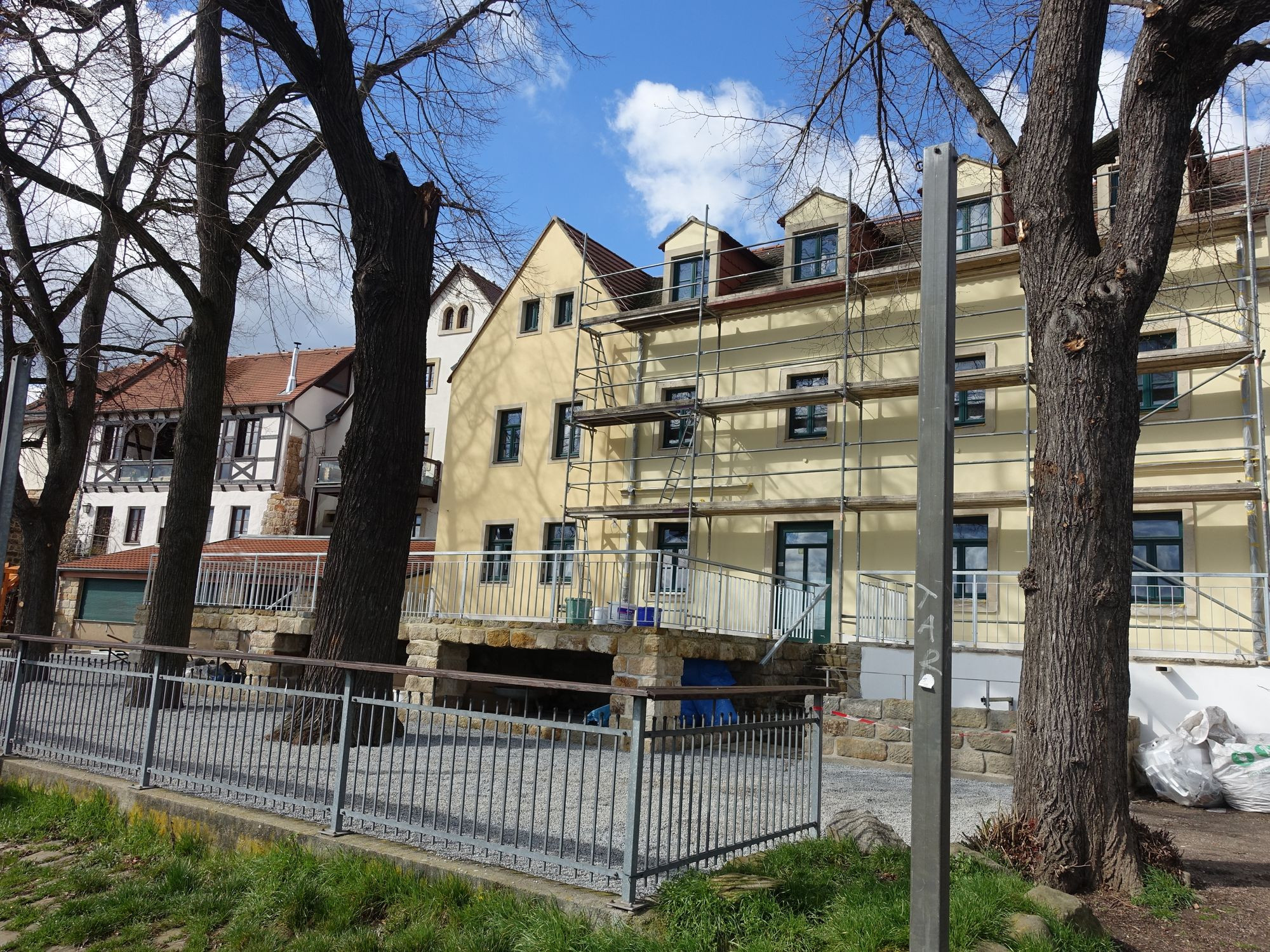 Die Lindenschänke selbst ist eingerüstet und bekommt gerade einen neuen Anstrich. Die Sandsteinmauern der Terrasse sind zurück gebaut, ein neues Geländer bereits fertig montiert. Eine neue Sandsteintreppe führt von der Terrasse jetzt direkt in den Biergarten, der mit frischem feinen Split versehen wurde. In der Ecke, wo früher eine kleine Bühne war, wird es eine Weinpergola und Lounge-Mobiliar geben, erzählt Mirko Unger bei einem Rundgang über die Baustelle.