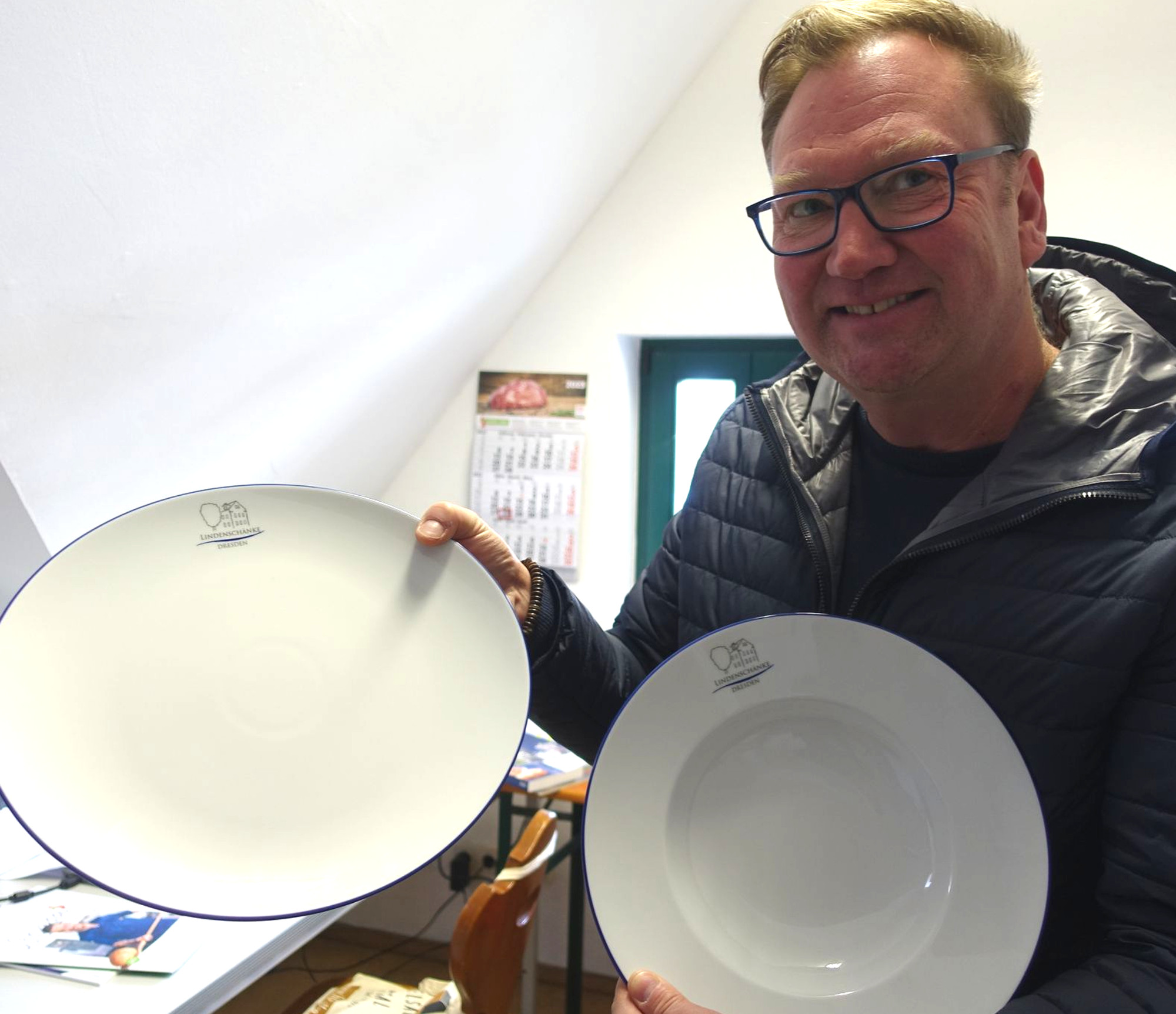 In seinem Büro unterm Dach zeigt Mirko Unger das neue Geschirr mit dem Lindenschänke-Logo. Foto: W. Schenk