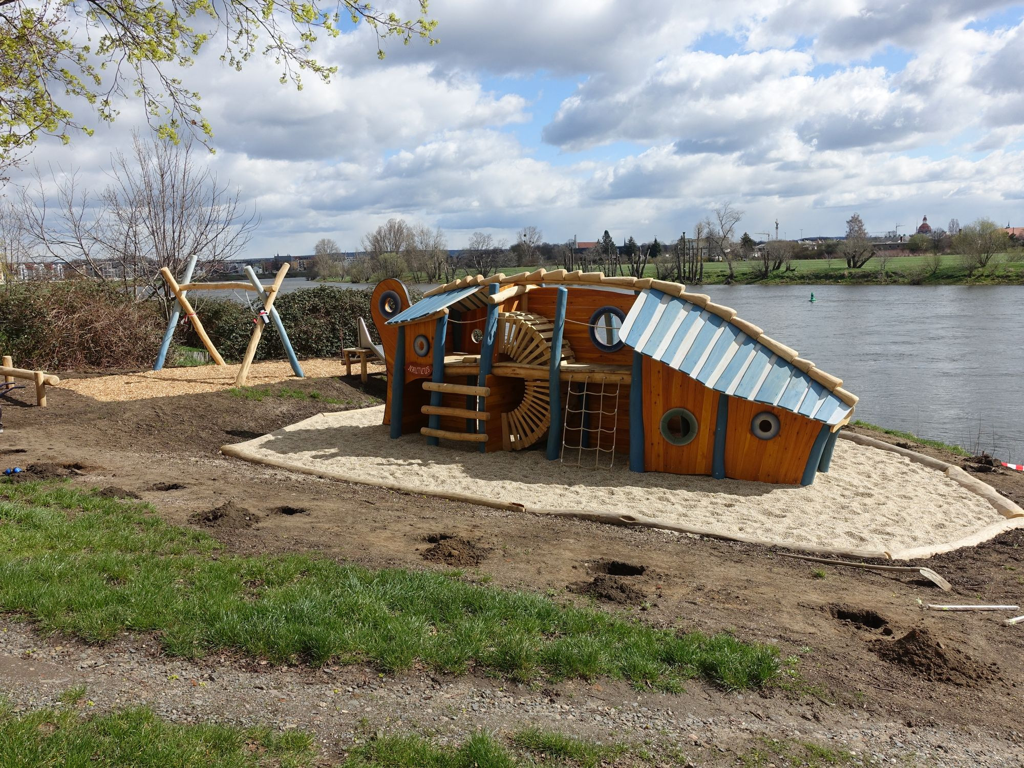 So entstand vor der Lindenschänke ein neuer Spielplatz. 40 Tonnen Feldkies wurden aufgeschüttet. Rutschen, Schaukeln und eine große „Nautilus“ aus Holz zum Klettern stehen bereits. Jetzt wird zum Schutz der Kinder noch ein Zaun errichtet. Schließlich befinde man sich hier nahe der Elbe.