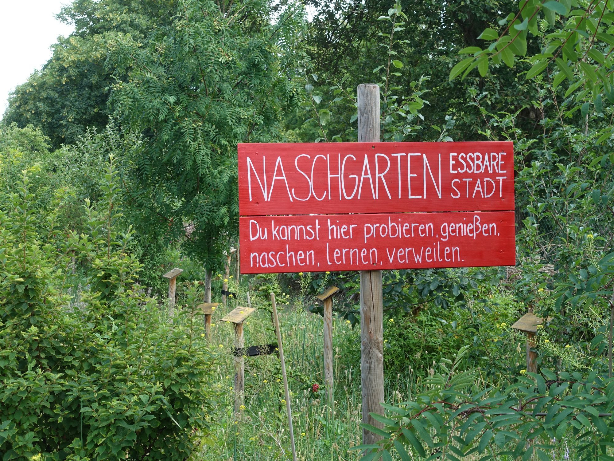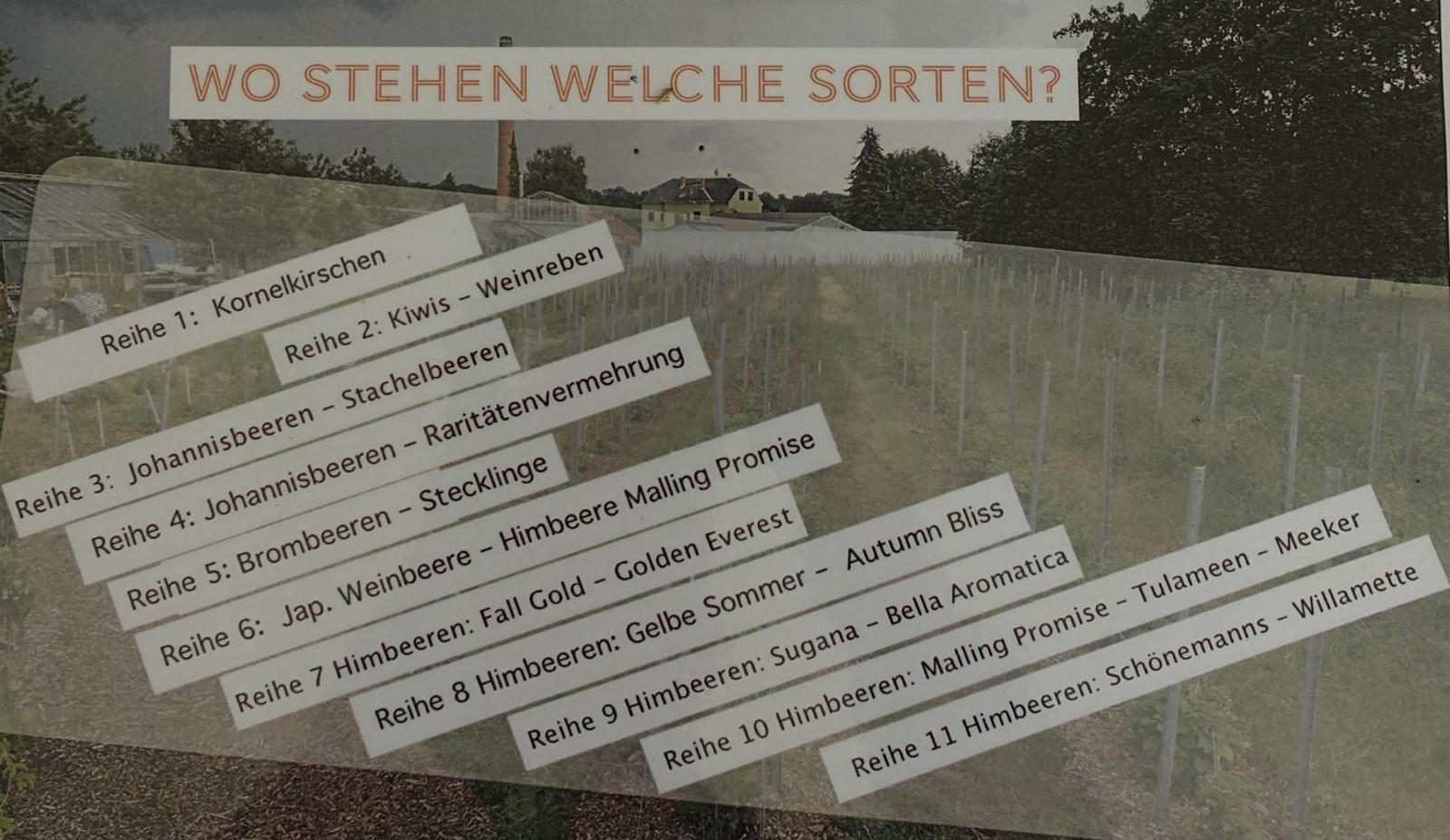„Für alle Neugierigen haben wir gleich hinter dem Eingang einen Naschgarten“, erzählt Sandy Hinrichs. Während die selbst geernteten Früchte nach Gewicht bezahlt werden müssen, ist das Probieren im Naschgarten kostenlos. Neben Holunder oder Felsenbirne wachsen dort auch Kaki, Ölweide oder Schisandra, deren Anbau hier erprobt wird. Kleine Holztafeln helfen den Laien mit Beschreibungen der Pflanzen. Was nicht vernascht oder selbst gepflückt wird, verarbeiten die Ehrenamtler zu Most, Sirup oder Marmelade.