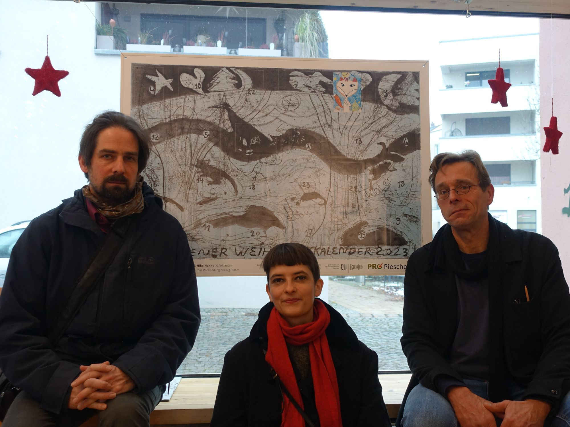 2021 hatten René Kaufmann und Friedrich Hausen die Tradition des Pieschener Weihnachtskalenders wiederbelebt. Bibliothek und beteiligte Kitas waren begeistert und wünschten sich eine Fortsetzung. Waren es bisher historische Fotos, ist jetzt mit den beiden Künstlerinnen eine neue Gestaltungsidee gefunden worden. „Wir werden sehen, wohin sich das entwickelt“, meinte Kaufmann. Das Projekt wurde vom Stadtteilfond Pieschen und Mickten gefördert. Darum hatte sich Friedrich Hausen gekümmert, während Satz und Layout sowie Organisation, Bildauswahl und Umsetzung des Kalenders in den Händen von René Kaufmann von Text & Dialog Dresden lagen.