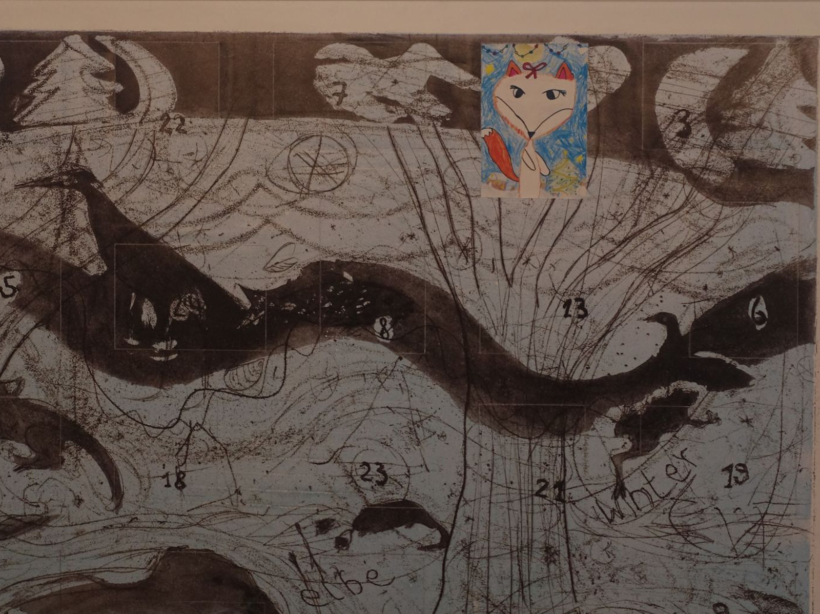 In der Bibliothek Pieschen ist heute das erste Türchen im Adventskalender geöffnet. Ein dreijähriger Junge aus der Kita Leuchtturm musste sich auf die Zehenspitzen stellen, um die „1“ zu erreichen. Zuvor hatten die Kinder der Gruppen Regenbogenfische und Seerobben gemeinsam das erste Feld auf dem Kalender gesucht. Initiator René Kaufmann hat ihnen erzählt, dass zwei Studentinnen der Hochschule für Bildende Künste das diesjährige Kalenderbild gestaltet haben. Gemeinsam suchten sie in der Radierung nach den Tieren auf den Elbwiesen und fanden einen Graureiher, eine Kröte, einen Biber oder vielleicht auch ein Fuchs und einen Hasen.