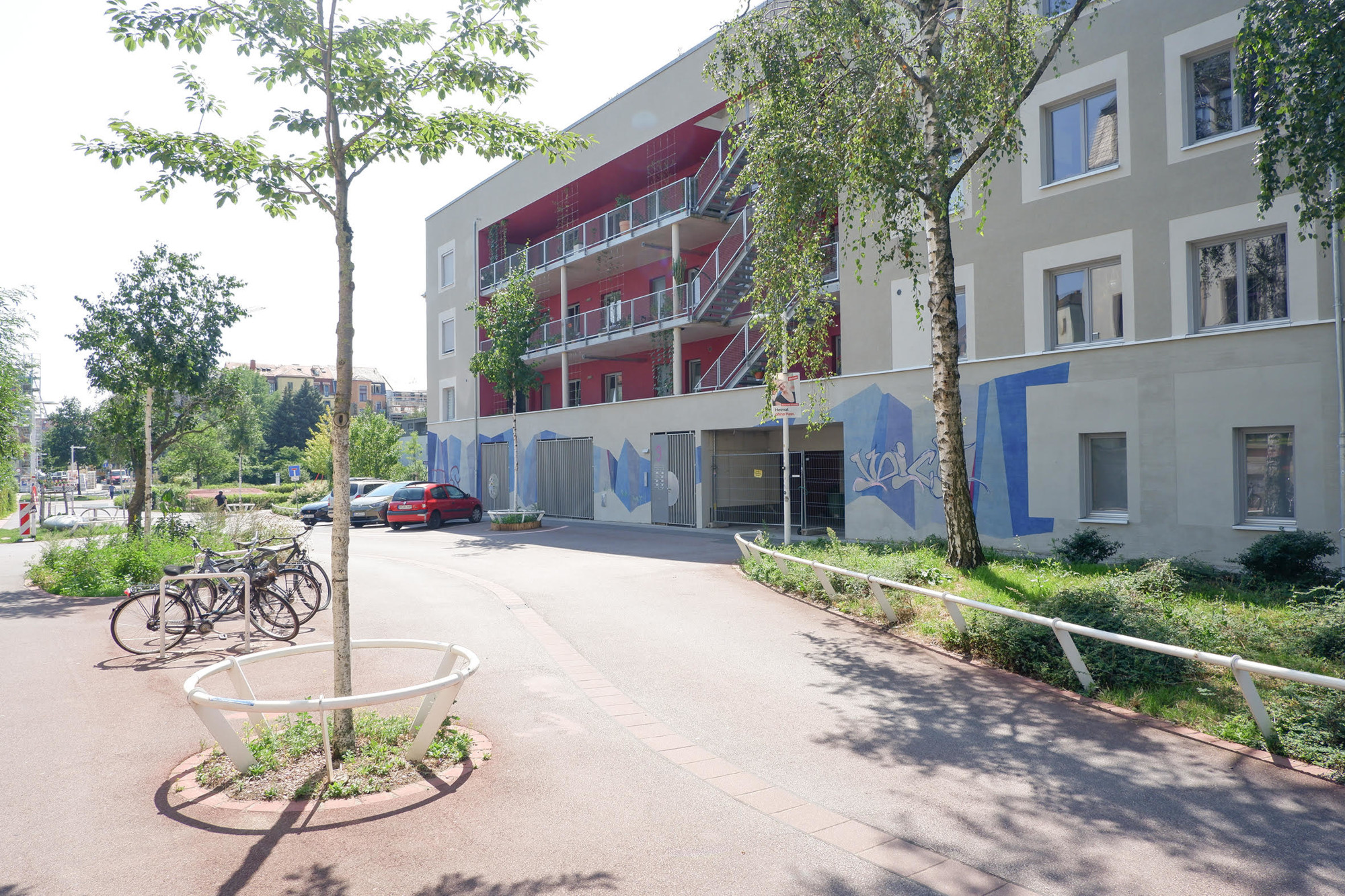 Vorangegangen war eine längere Diskussion in der Eigentümergemeinschaft, die das Haus 2021 bis 2022 errichtet hat. „Was tun mit den Graffitis, die schon kurz nach der Fertigstellung auf der Fassade zu finden waren“, lautete die Frage. Verschiedene Ideen, auch das Übermalen, waren im Gespräch. Während der Schriftzug „Voice“ noch mit einem künstlerischen Anspruch daherkommt, fällt es schwer, dies auch anderen Graffitis an der Hauswand zuzugestehen. Und die sollen dann auch noch in ein neues Gesamtkunstwerk eingebunden werden? Genau davon hat Henning Haupt die Eigentümergemeinschaft mit seinen Entwurfsskizzen überzeugt. Man kennt sich gut. Er ist in eine der Wohnungen als Mieter eingezogen.