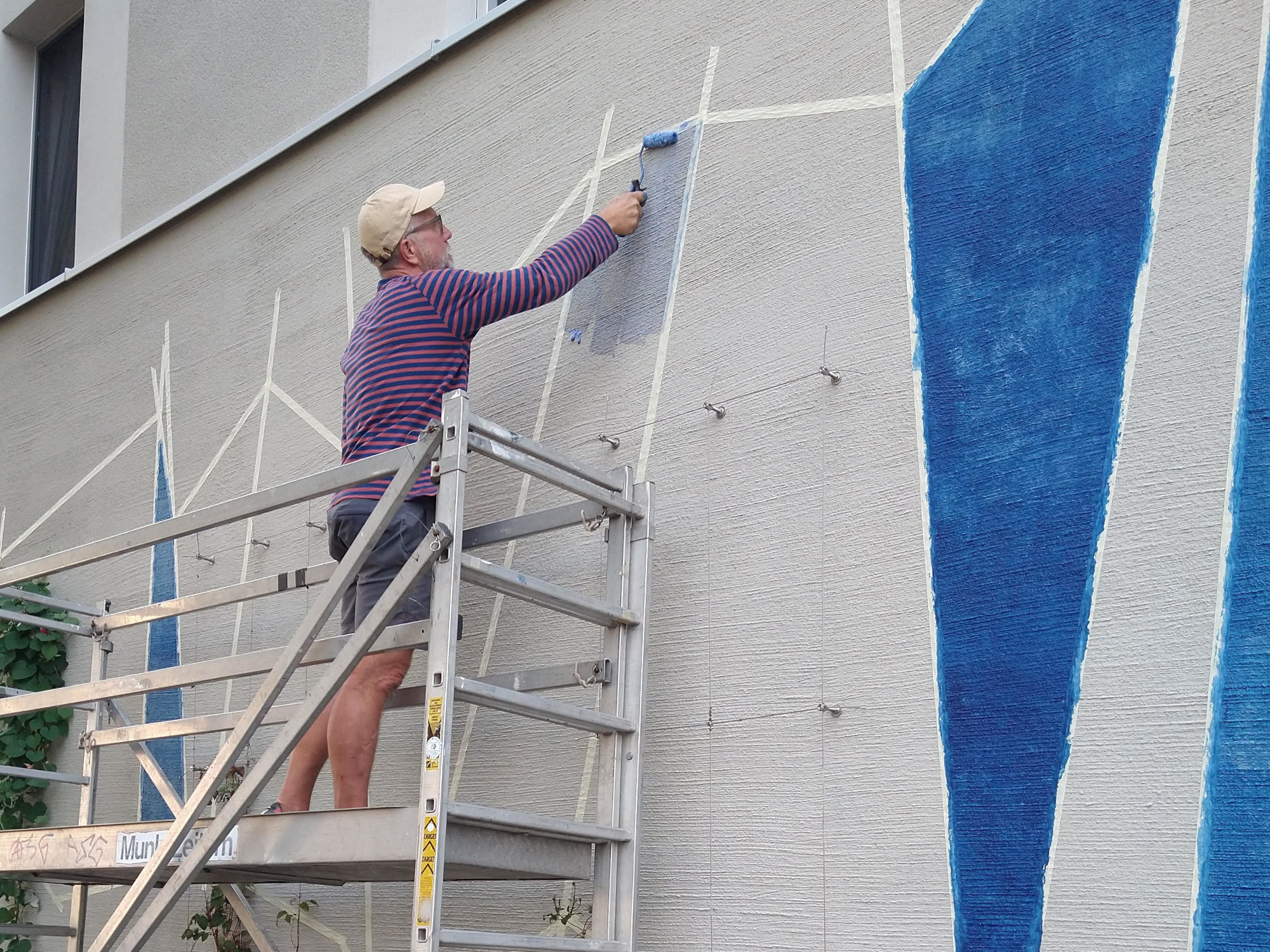 “Die Wandmalerei für die Fassade in der Rosa-Steinhart-Straße besteht hauptsächlich aus durchscheinenden Farben. Sie erstreckt sich über die gesamte Erdgeschossfassade und reicht bis zur Gesimskante“, erläutert Haupt sein Werk. „Ich finde es spannend, wie in der Verbindung von Malerei und Graffiti, der Street Art, eine vom Prozess der Entstehung bestimmte kollektive Malerei den Stadtraum verändert“.