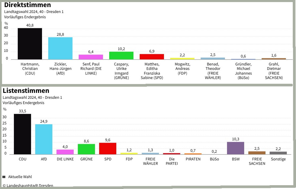 Landtagswahl 2024: Ergebnisse im Wahlkreis 40, Dresden 1. Quelle: Landeshauptstadt Dresden
