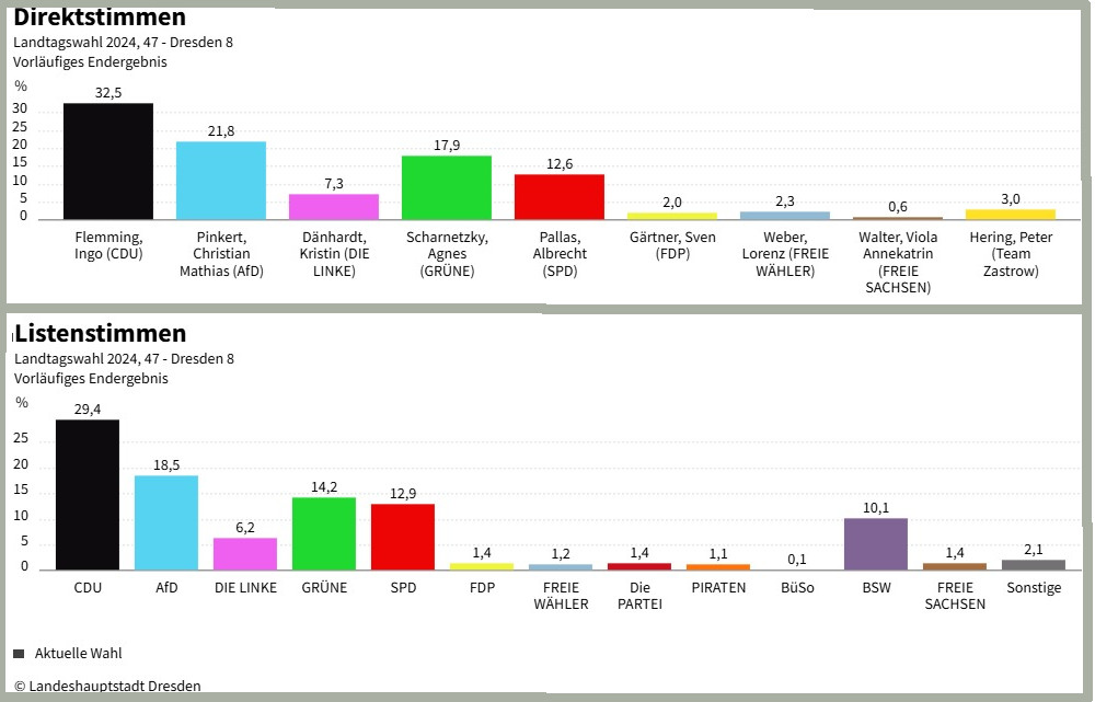 Landtagswahl 2024: Ergebnisse im Wahlkreis 47, Dresden 8. Quelle: Landeshauptstadt Dresden