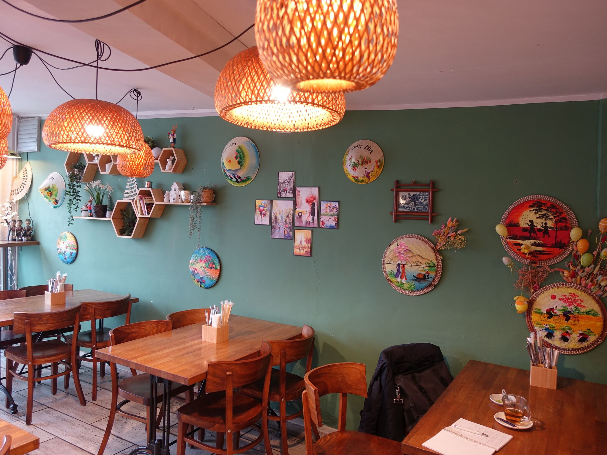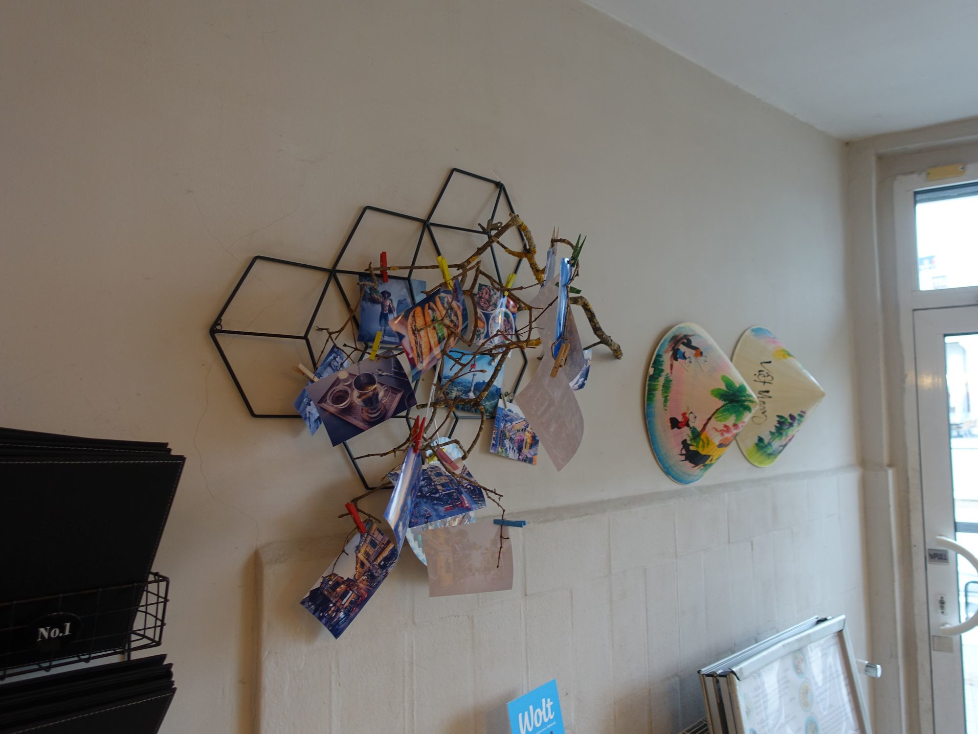 Die Brüder Do haben zum Start 2017 auf das typische rot-gelbe Asia-Design ganz bewusst verzichtet. Das ist auch so geblieben. Quynh Nguyen ergänzte die eher sparsame Ausstattung nun mit landestypischer Dekoration. Ansichtskarten aus der Heimat und bunte spitze Hüte zieren jetzt die Wände. Die Gerichte auf der Speisekarte sind zudem mit Bildern versehen. Das hätten viele Gäste als besonders hilfreich empfunden, meinte sie. Bei der Online-Bestellung muss man allerdings ohne die Fotos auskommen. Nach 40 Minuten sind die Gerichte abholbereit. Das Bistro kooperiert mit den Lieferdiensten Lieferando, Wolt und Uber.
