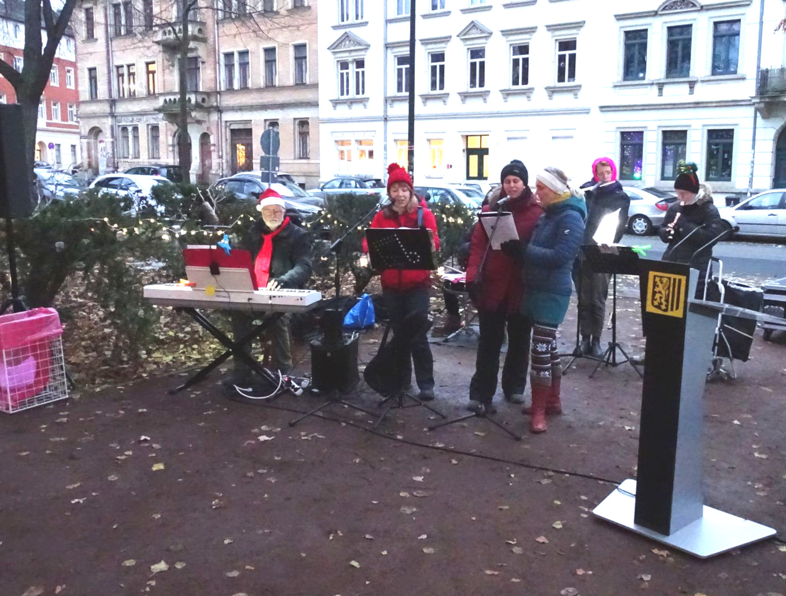 Doch zuvor wurde gemeinsam gesungen. Die Laurentiuskirchgemeinde verteilte kleine Textheftchen für alle, die eine Erinnerung brauchten. Die Stadtkapelle Pieschen unter Leitung von Joachim Adolphi am Klavier demonstrierte ein beeindruckendes Repertoir an Weihnachtsliedern mit drei stimmsicheren Sängerinnen, Querflöte, Blockflöte und Schlagzeug.