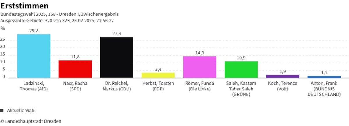 Die AfD liegt in den beiden Dresdner Wahlkreisen zur Bundestagswahl 158 (Dresden 1) und 159 (Dresden 2 / Bautzen 2) – zum dem auch der Stadtbezirk Pieschen gehört – klar vorn. Um 22.40 Uhr fehlte noch das Ergebnis aus einem Stimmbezirk. Die CDU hat ihre Direktmandate an Matthias Rentzsch (159) und Thomas Ladzinski (158) verloren. Während CDU-Bewerber Lars Rohwer 2021 im Wahlkreis 159 (damals 160) mit denkbar knappen 35 Stimmen Vorsprung vor dem AfD-Kandidaten gewann, liegt Konkurrent Rentzsch jetzt mit rund 10.000 Stimmen Unterschied vorn.
