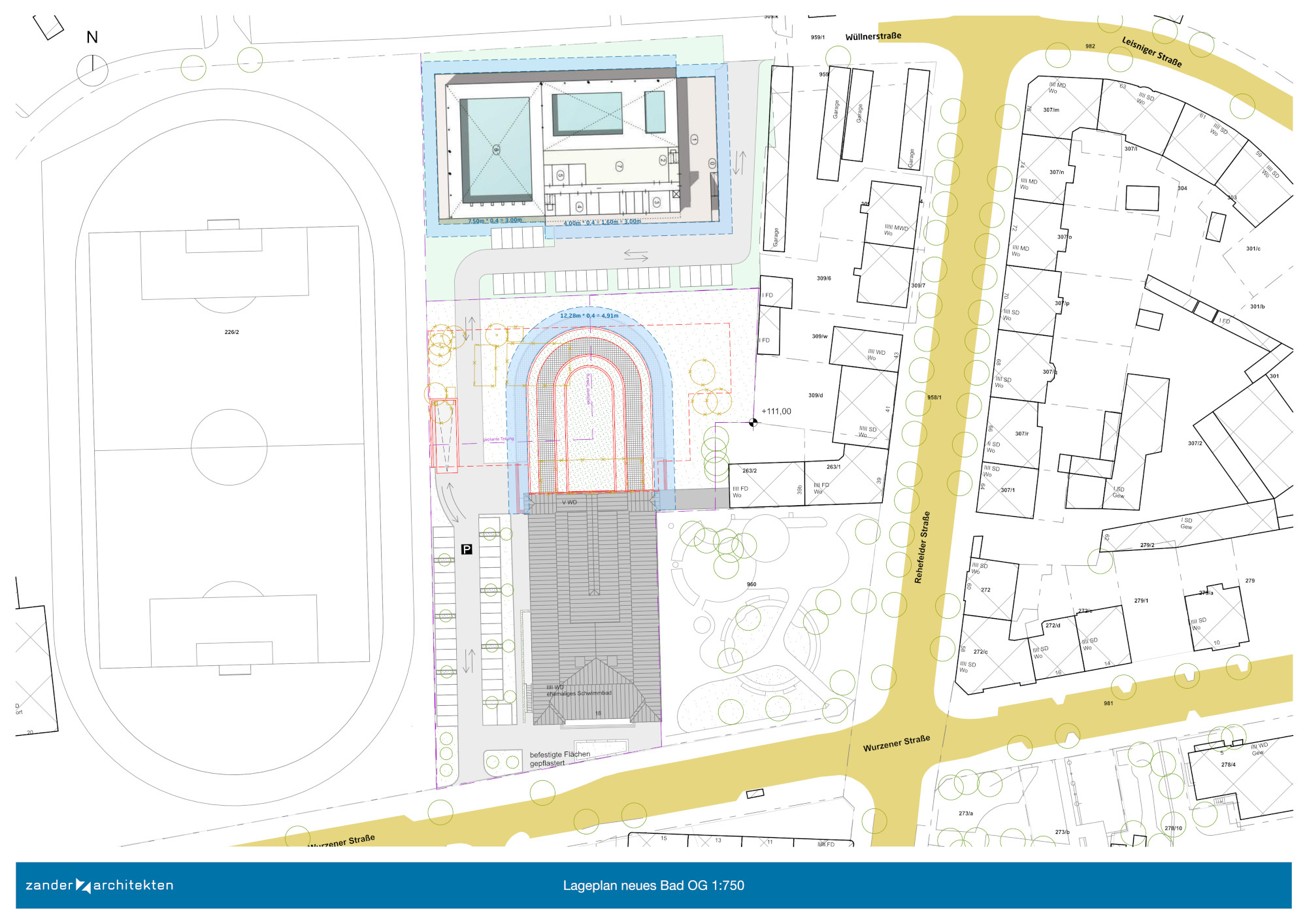 Nördlich des Sachsenbades mit Anbau ist der Standort für einen Schwimmhallen-Neubau eingeordnet. Quelle: zanderarchitekten