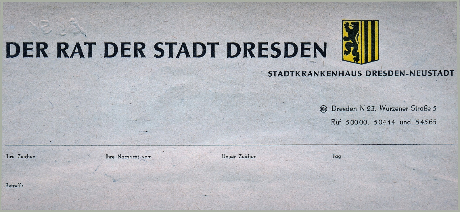 So war am 18. Mai 1949 beim Stadtkrankenhaus Dresden-Neustadt das Rundschreiben 6/49 der Landesregierung Sachsen (Ministerium für Arbeit und Sozialwesen) mit der Maßgabe eingegangen, es der Betriebsgewerkschaftsleitung (BGL) zur Kenntnis zu bringen. Dem Rundschreiben wurde Folgendes vorangestellt: „Wir haben ein Interesse daran, in einem nicht allzu langsamen Tempo die materielle Ausstattung unserer Gesundheitseinrichtungen auf einen normalen Stand zu bringen.“