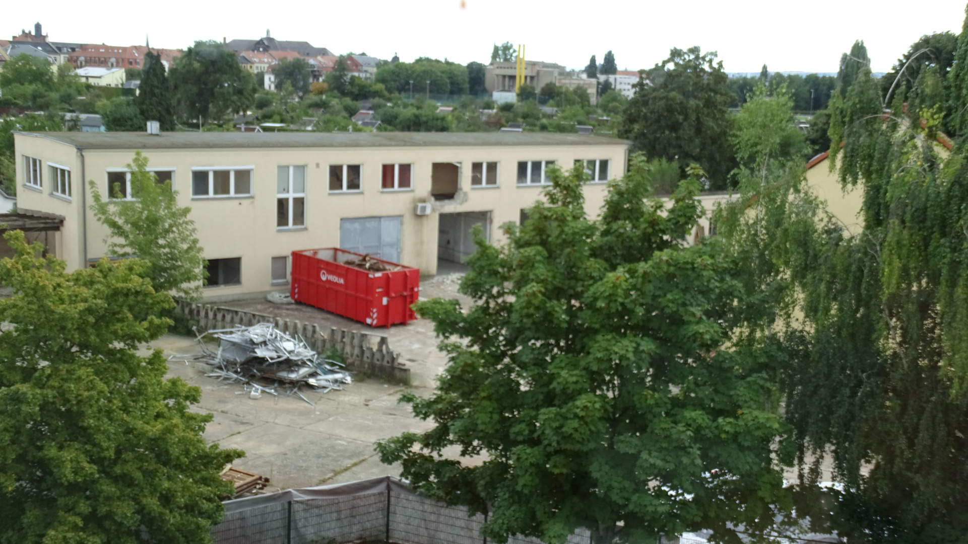 Indessen laufen die Abrissarbeiten auf dem Areal, wo bis zum Sommer noch Maler, Elektriker, Klempner, Kfz-Schlosser oder auch ein Folientechniker ihre Werkstätten hatten. An einem der Gebäude ist noch die Aufschrift zu erkennen: „Produktionsgenossenschaft Handwerk. Aufbau. Erbaut 1958“.
