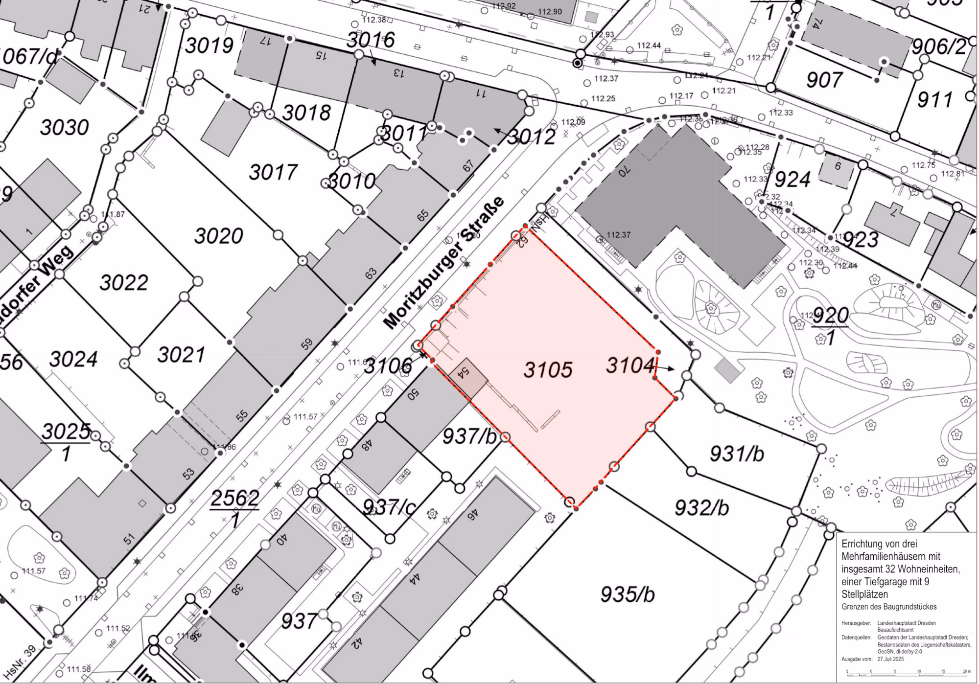 In der Moritzburger Straße wird eine weitere Brachfläche mit Wohnungen bebaut. Neben der Nummer 70 – hier befindet sich die Kita „PiMo“ – sollen auf einem rund 1.600 Quadratmeter großen Grundstück drei Mehrfamilienhäuser errichtet werden. Das geht aus der Baugenehmigung hervor, die am 24. Juli 2025 in der elektronischen Ausgabe des Dresdner Amtsblattes veröffentlicht wurde.