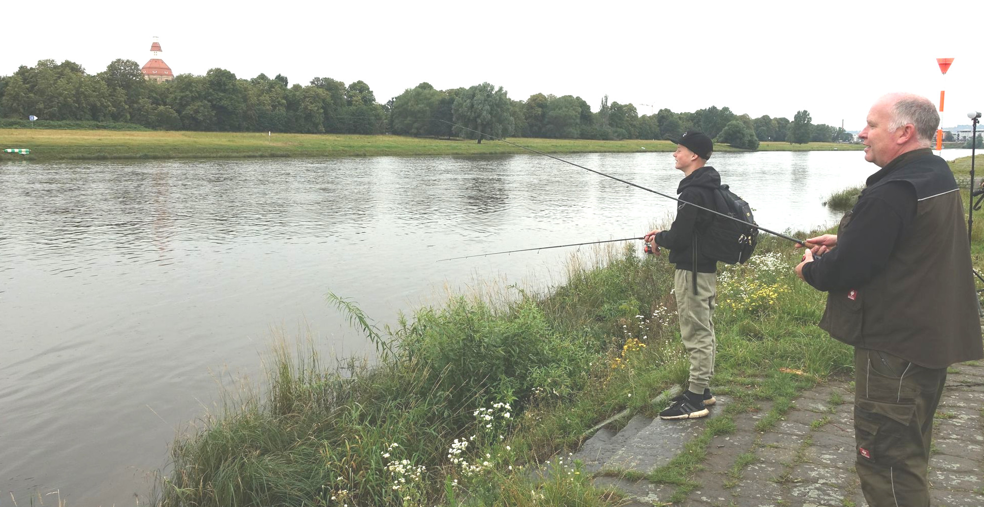 Am Elbufer in der Nähe des Grillplatzes Eisenberger Straße stehen Kay und Ben Aubrecht. Ein leichter Nieselregen fällt aus dem