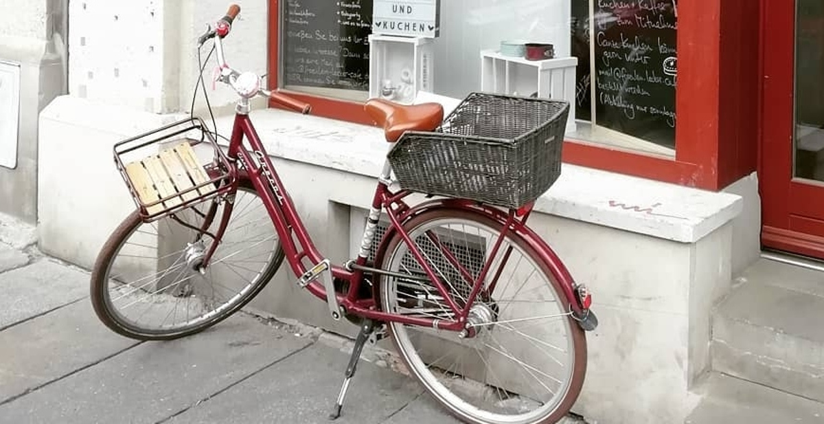 Das rote Fahrrad gehört zum Café Gemüsetorte wie das tägliche Mittagsangebot oder die veganen Muffins. Ist es neben dem Schaufenster