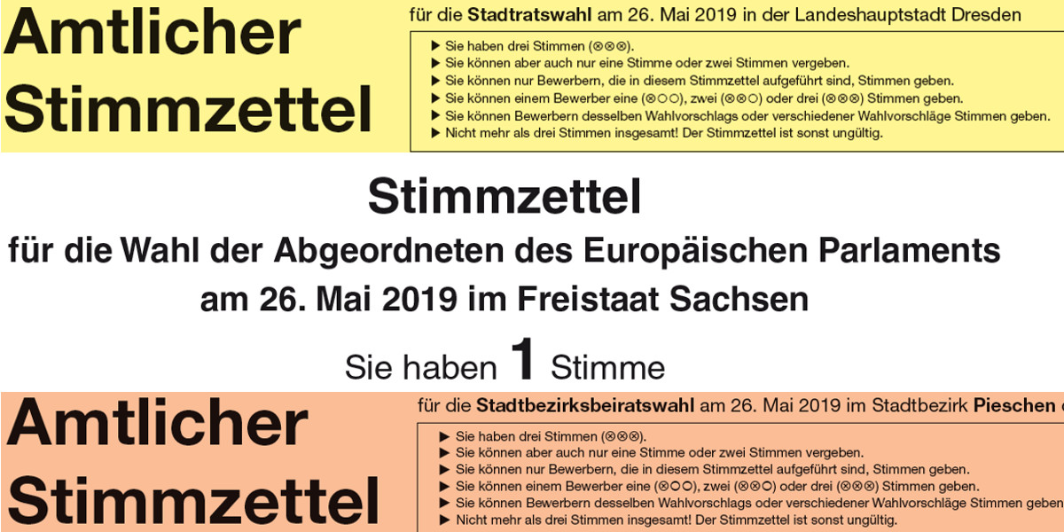 Drei Stimmzettel bekommt jeder Wahlberechtigte in den 33 Wahllokalen im Stadtbezirk Pieschen am 26. Mai ausgehändigt. Während bei der Europawahl