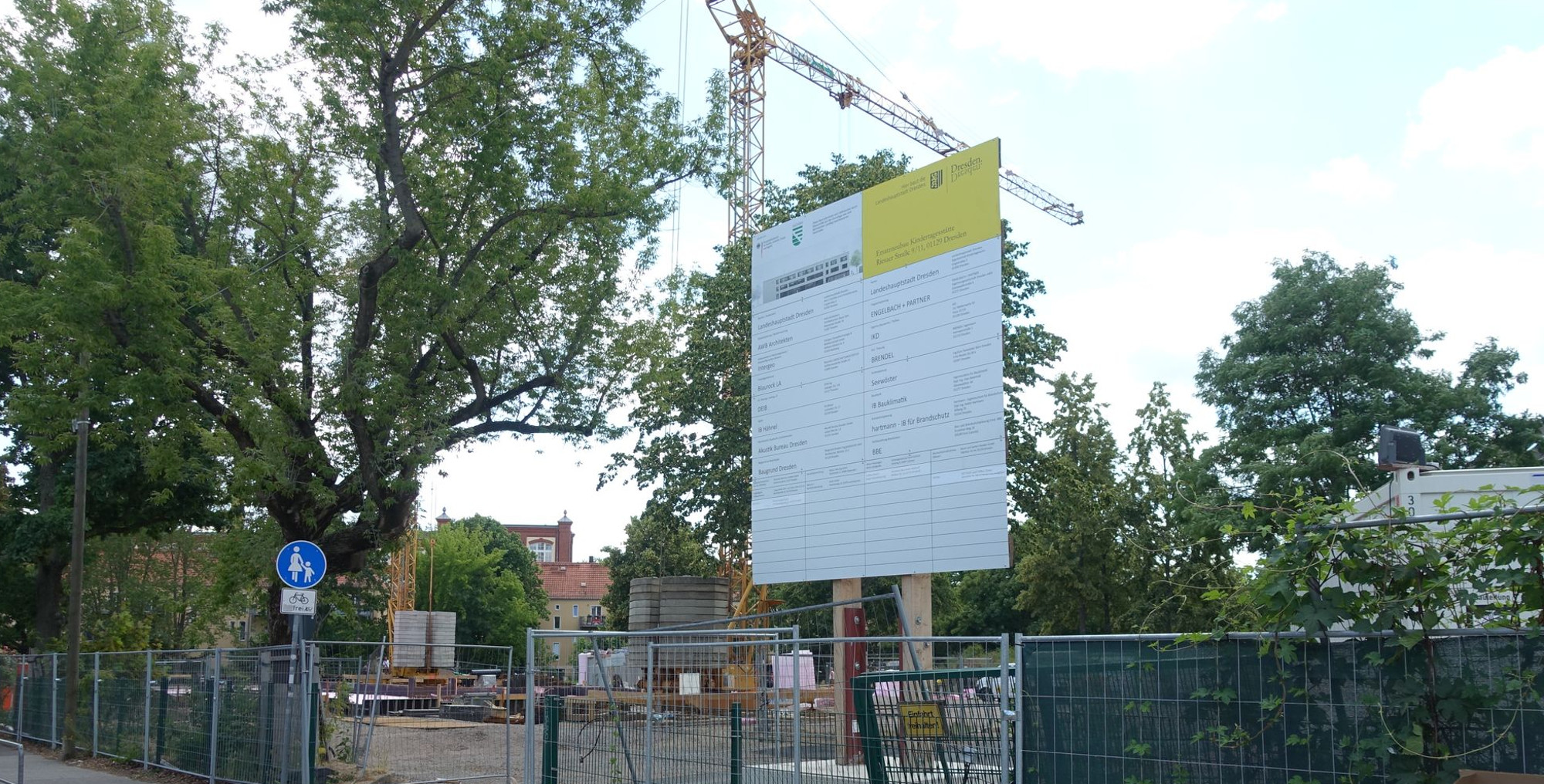 In der Riesaer Straße laufen die Bauarbeiten für die Kita „Pieschener Kinderinsel“. In dem Neubau wird Platz für 291 Kinder