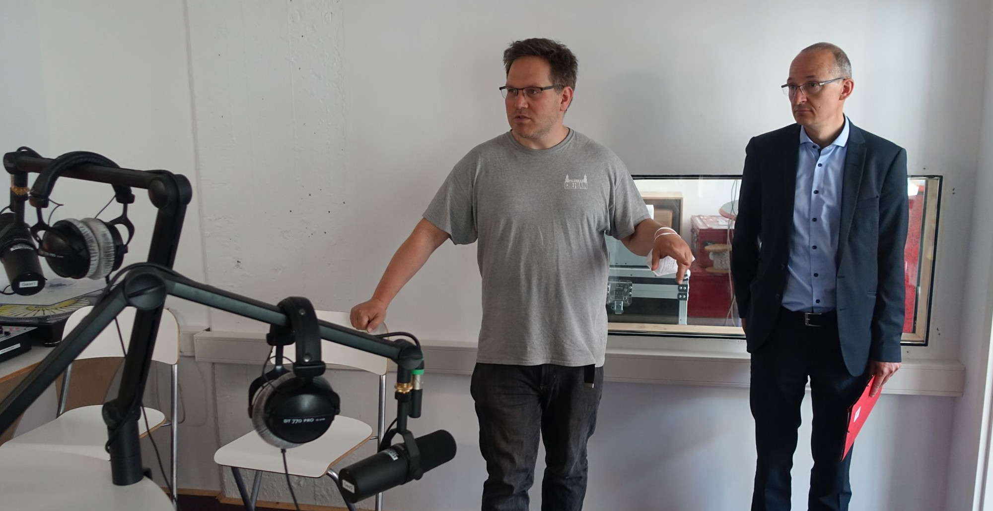 Sonnenschutz durch Raffstoren für ein Filmstudio, die Einrichtung eines Seminarraums mit kleiner Teeküche für ein Radioprojekt, Holzfußboden statt Estrich und