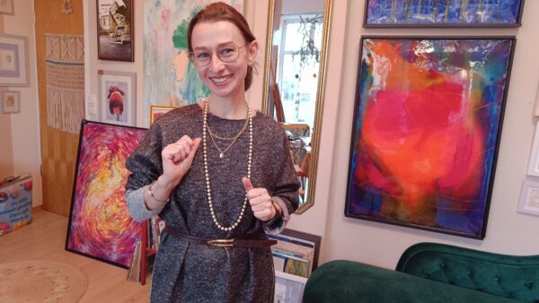 Fluoreszierend leuchtet der Schriftzug „Kunstatelier Svetlana Petrasch“ im Schaufenster. Hinter dem Glas erscheinen Farbflächen, organische Formen, leuchtende Kompositionen – Gemälde,