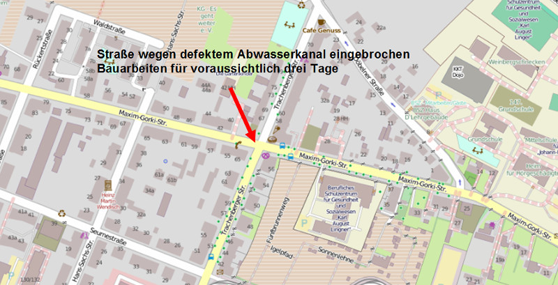 Seit gestern früh laufen an der Ecke Maxim-Gorki-Straße und Trachenberger Straße Reparaturarbeiten. Wegen eines defekten Abwasserkanals war hier die Straße eingebrochen.