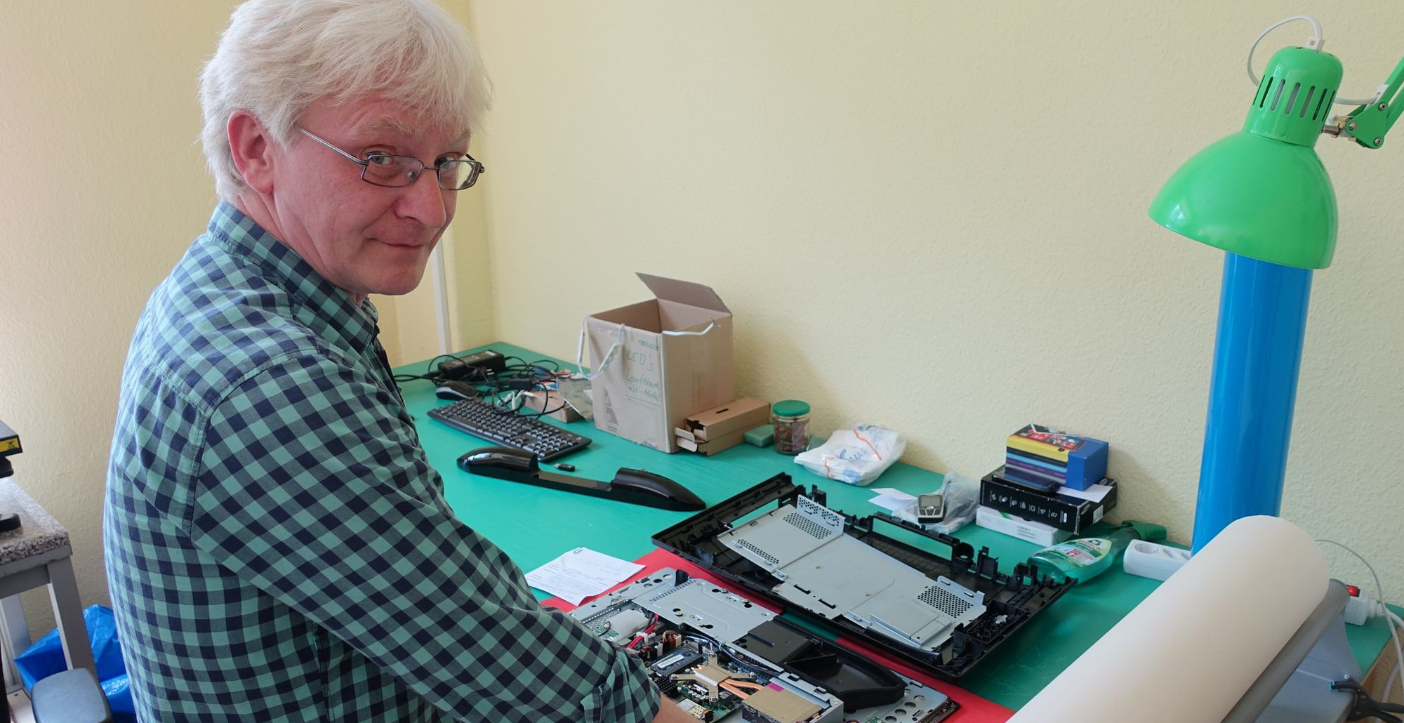 Auf dem Tisch liegen die Teile eines auseinander genommenen All-in-One-PC. Jörg Schluttig zeigt auf Staubflusen an der Lüftung. „Die Reinigung