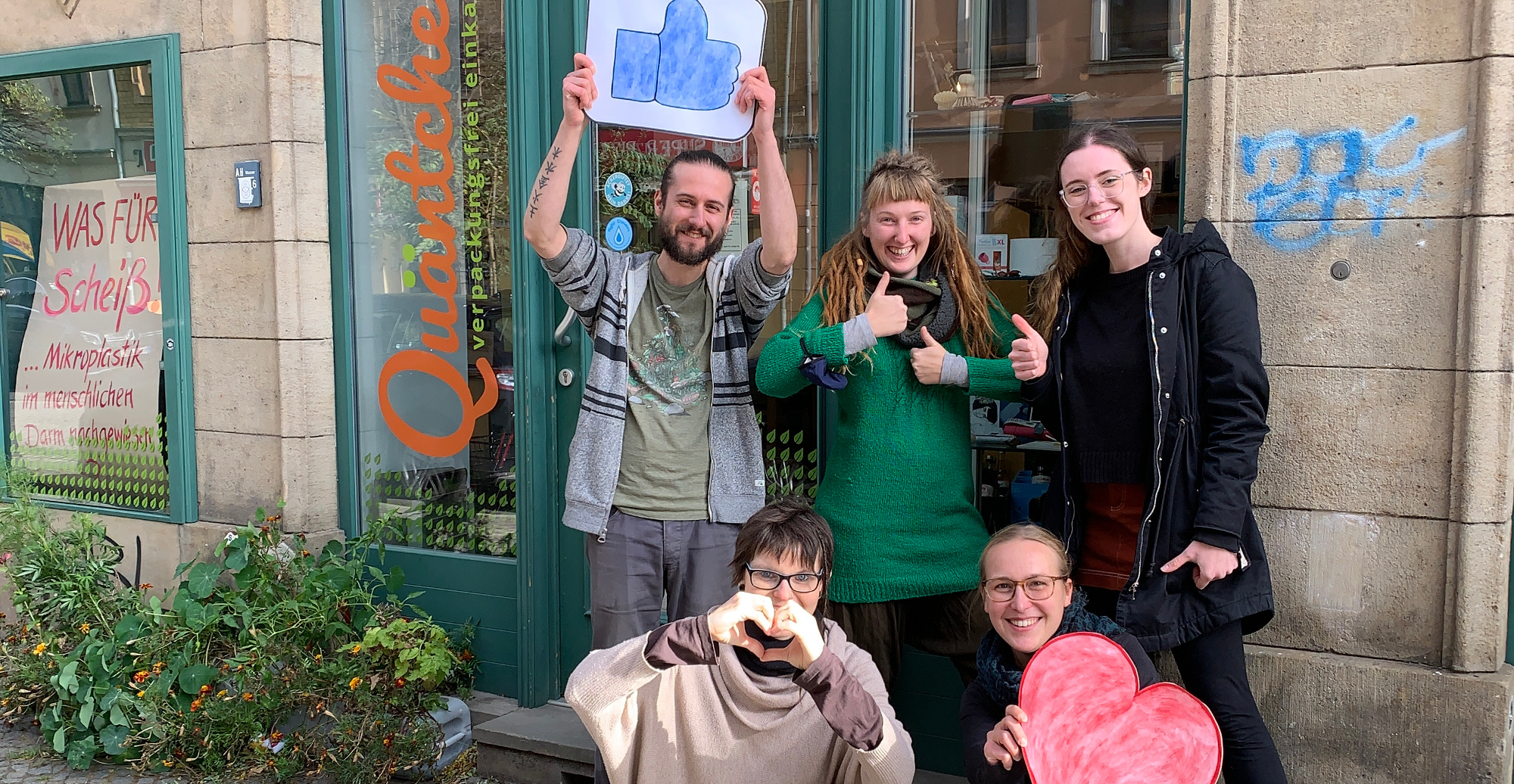 Lea Haubold hat den Schriftzug vom Unverpacktladen „Quäntchen“ in bunten Farben auf sechs Tafeln gesprayt. Damit stand sie gestern an