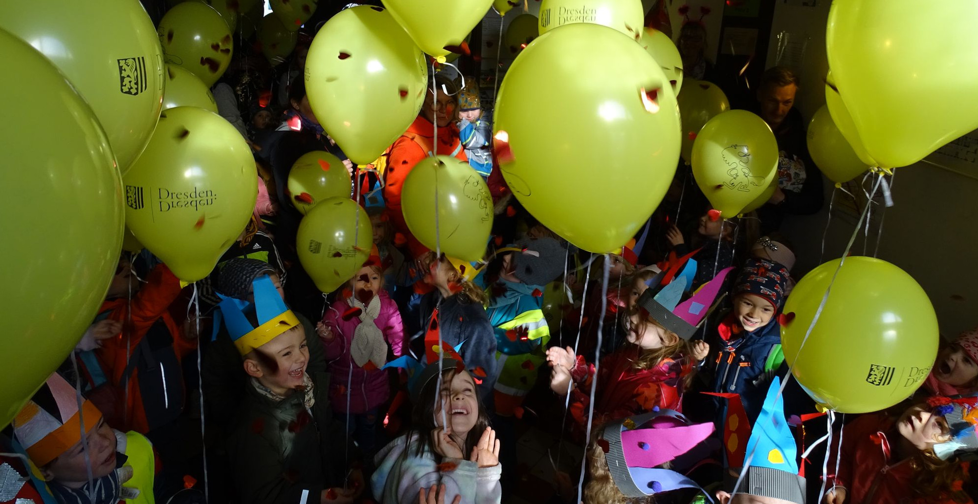 Die Akteure von „Karneval in Pieschen“ feierten heute mit Kindern aus der 26. Grundschule, der Kitas Pfiffikus und Bimbambino den