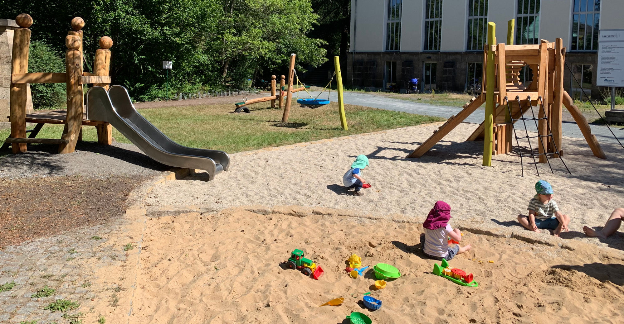 Auf dem Spielplatz in der Albert-Hensel-Straße ist wieder Leben. Etwas größer als vorher, mit frischem Grün und neuem Sand präsentiert